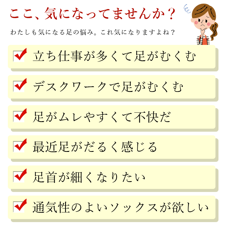 日常生活で日々ご使用いただくものですので、製造から検品まで一貫して日本製にこだわり、安心安全の靴下を、今回この価格でご提供できるようにさせていただきました!オフィスワークなど座った仕事が多い方、接客業や主婦など立ち仕事の多い方、ウォーキングやゴルフなど歩き回ったり足先を踏ん張るスポーツ。
